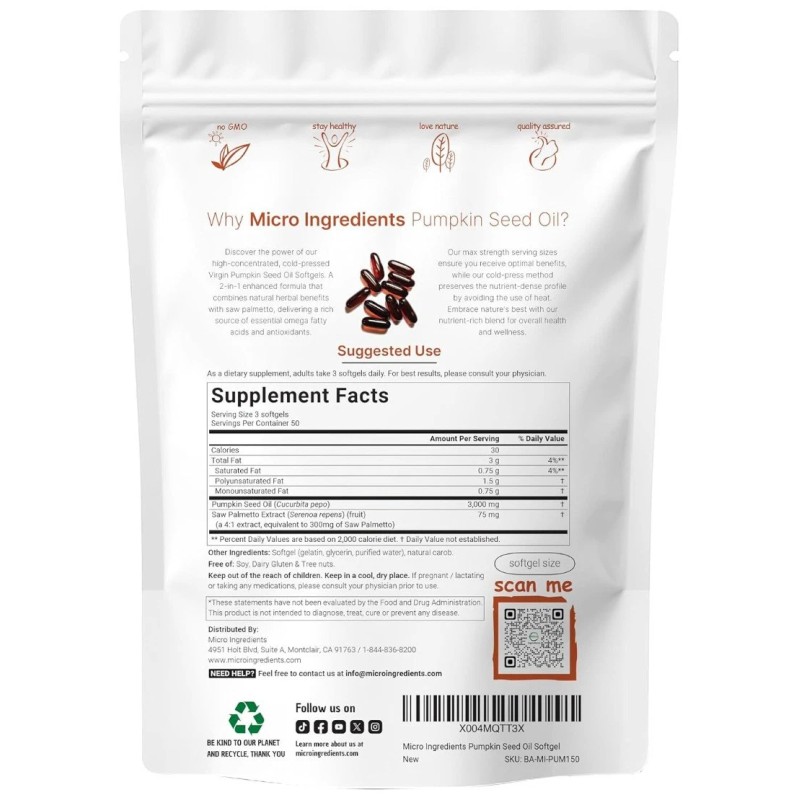 - Micro Ingredients offers max strength virgin pumpkin seed oil softgels, high concentrated cold-pressed ingredients, 2-in-1 complex with saw palmetto extract, retains essential fatty acids, phytosterols, and antioxidants.