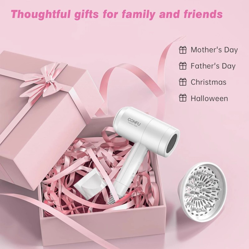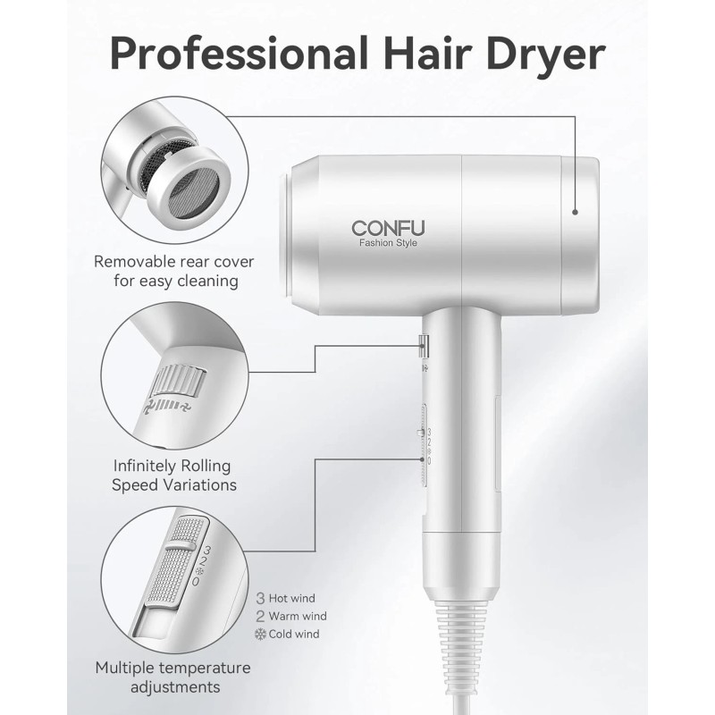 【Secador de Pelo CONFU con Protección de Seguridad y Baja Radiación】 Cuando la temperatura es demasiado alta, el secador de iones cuenta con una función de protección contra sobrecalentamiento que se apaga automáticamente, garantizando la seguridad de su familia. El secador de pelo CONFU cuenta con certificación ETL, 125 V 60 Hz y enchufe de seguridad ALCI (solo EE. UU.). No dude en contactarnos si tiene alguna pregunta sobre nuestro secador de pelo.