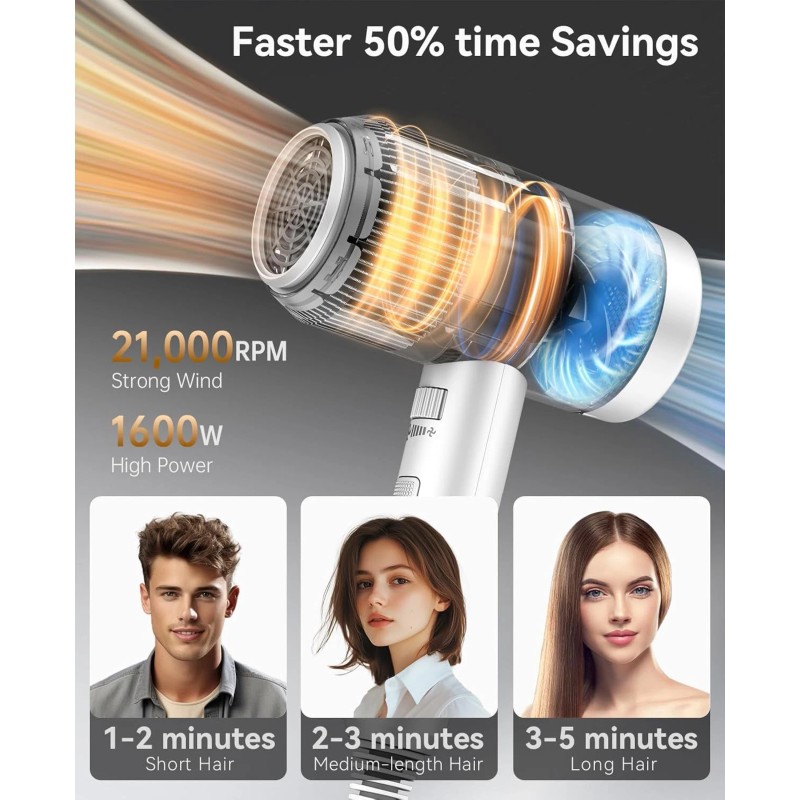 Secador de pelo con motor premium de 1600 W: Nuestro secador iónico ofrece un viento más potente para secar el cabello en menos tiempo que otros. Es ligero y portátil, ideal para viajes. Motor de alta velocidad de hasta 21 000 rpm.