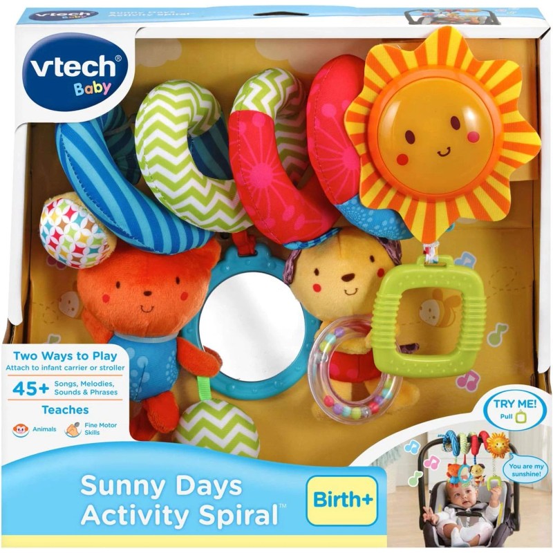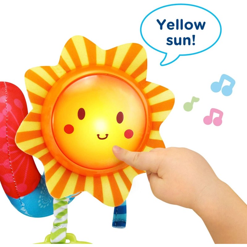 Bring the sun with you wherever you go! The sunny days activity spiral packs a smiling sun and four dangling accessories into a portable, bendable electronic toy. Wrap it around the bar of an Infant carrier or a stroller to help your baby stay entertained on the go. Push the smiling, light-up sun to hear songs and phrases. Dangling toys encourage little ones to reach, grab, bat and push! When babies pull on the easy-to grasp square handle, They are rewarded with sounds and songs. The soft puppy invites exploration with a spinning rattle, and the soft Kitty includes a surprise squeaker inside. Multiple textures, colors and patterns help babies develop their senses of sight and touch. A baby-safe mirror helps little ones along in their journey of self-discovery. Fill every day with sunshine with this take-along activity spiral. Intended for ages birth to 24 months. Requires 1 AAA battery. Battery included for demo purposes only. New battery recommended for regular use.