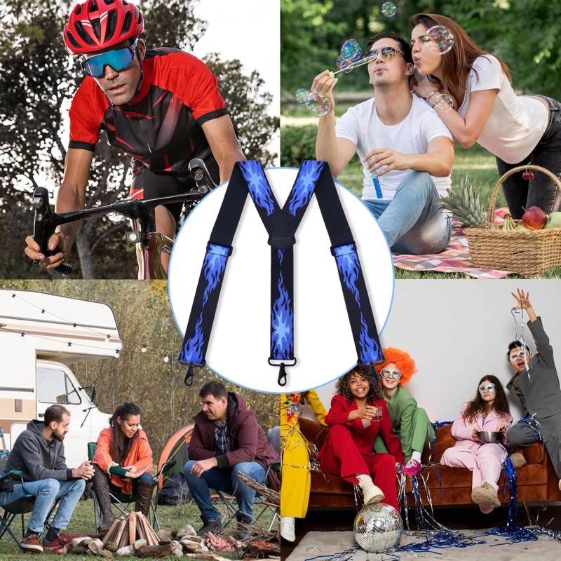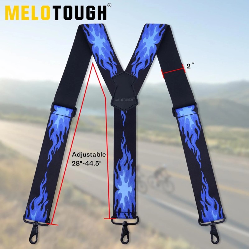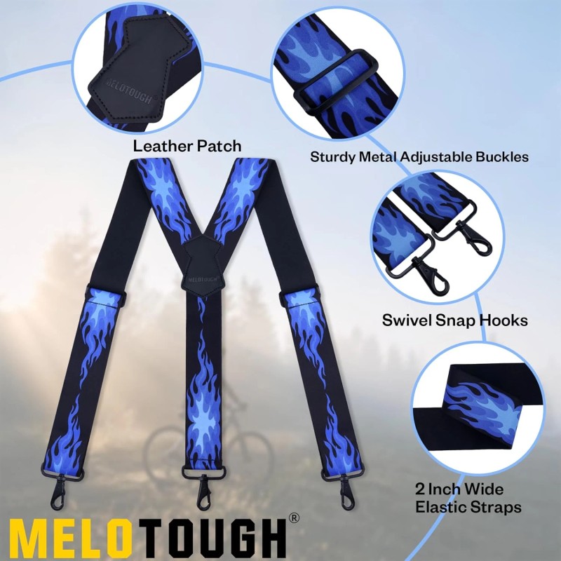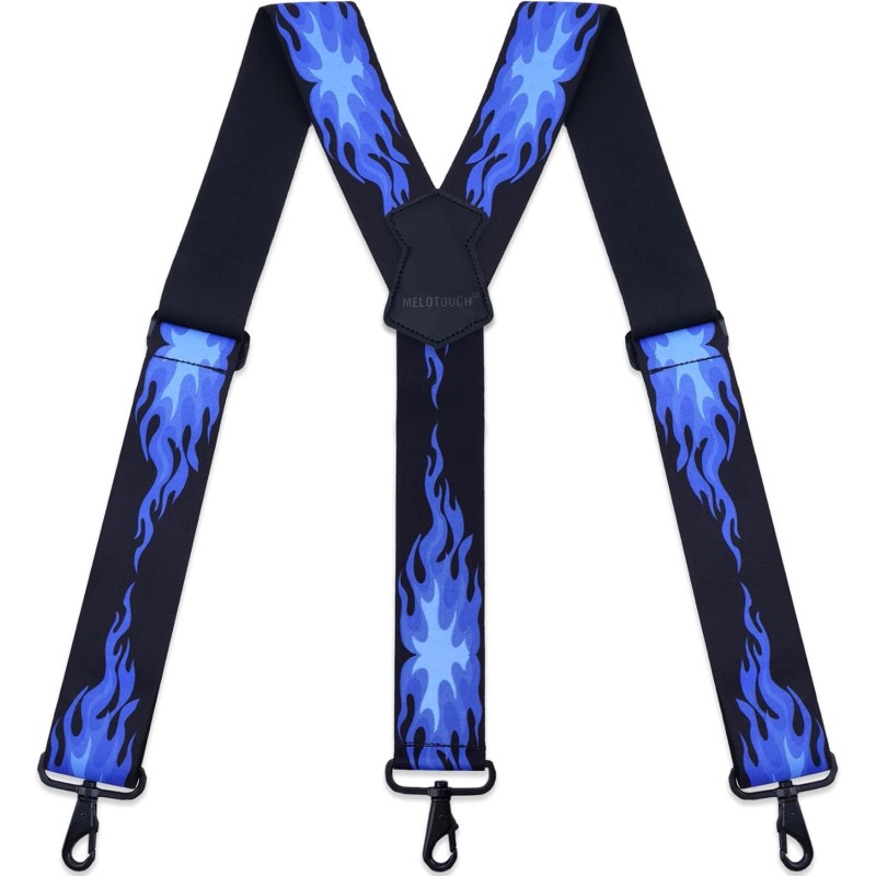 1.MELOTOUGH 2 inch wide suspenders feature an all-elastic design and are equipped with two metal adjustment buckles. They can be easily adjusted within the range of 28" to 44.5". Suitable for both men and women, they can be adjusted to your most comfortable size at any time according to your needs 2.Metal swivel hook, not easy to rust and break, capable of securely hooking onto the loop of jeans, keeping your pants up at all times without damaging or scratching your beloved clothes 3.Y back suspenders are designed to evenly distribute pressure, allowing you to enjoy comfort and show off your individual style at the same time 4.Hook suspenders for men are available in three styles: classic black, steady coffee color, and a unique blue flame pattern. Each style is suitable for a variety of occasions and styles, meeting your diverse needs