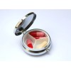 Pill case is metal measures just under 2 inches in diameter. Case has 3 dividers inside. Case has a button to open and is securely hinged.