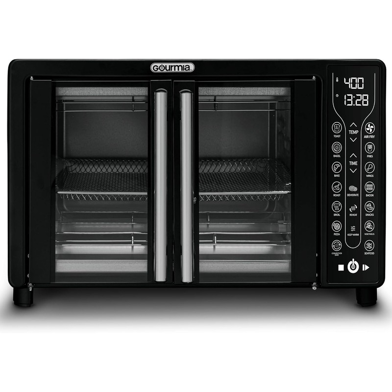 One appliance. Endless possibilities. Treat yourself to healthy and delicious meals with the Gourmia Digital French Door Air Fryer Toaster Oven. Fry Force 360° Technology cooks food quickly and evenly with little to no oil. 17 One-Touch Cooking Functions allow you to air fry, bake, dehydrate, and more - with just a tap. Use easy-set digital controls to adjust time, temperature, and toast settings. The oven fits a 12’’ pizza or 6 slices of bread. A large viewing window, compact design, and French doors set this Air Fryer Toaster Oven apart. Includes dishwasher safe air fry basket, oven rack, baking pan, and crumb tray. FryForce 360° Technology Precision engineered, patented air flow duct system creates a powerful cyclonic heat flow while blowing air directly over heating elements and onto food, resulting in the perfect crispy fry - with little to no oil Powerful Air Circulation Targets food with fast, super-heated air from every direction Perfect Crisp Gives food a golden, crispy exterior and moist interior Healthy Eating Enjoy all of your favorite foods with little to no oil Express Heat System Cooks food up to 30% faster than most ovens 17 One-Touch Cooking Functions: Air Fry, Toast, Bagel, Bake, Roast, Broil, Pizza, Convection Bake, Dehydrate, Reheat, Keep Warm, Fries, Wings, Bacon, Snacks, Vegetables, Seafood