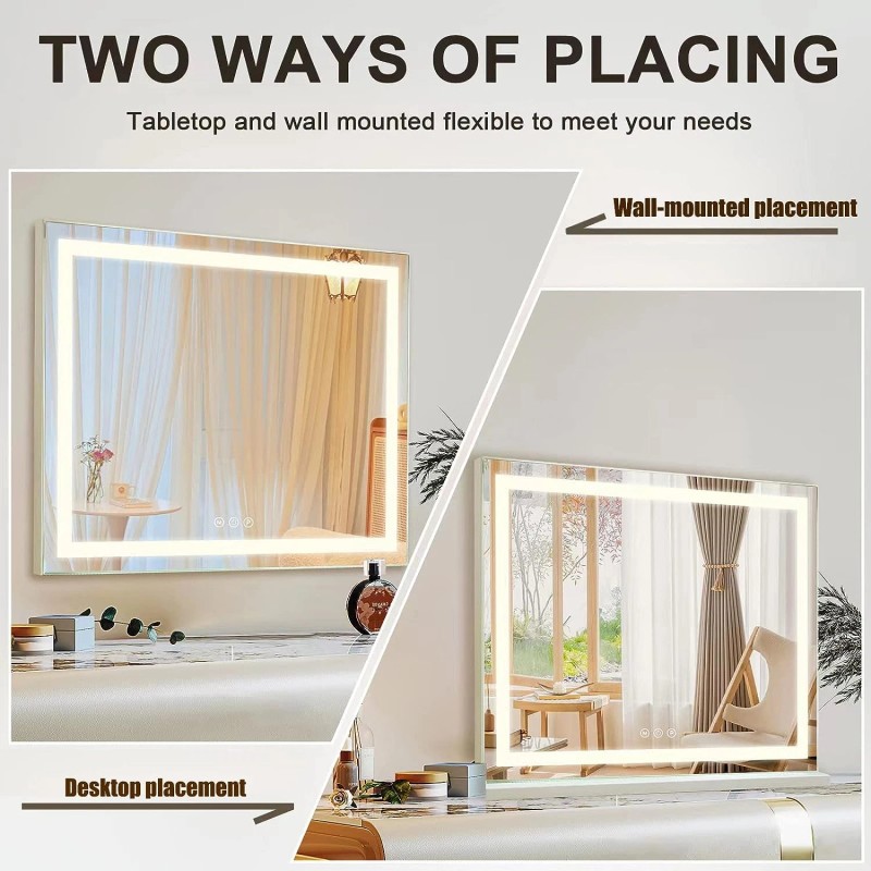- ✔️【Touch control and memory function】This vanity makeup mirror is designed with a touch screen mirror. The left "M" button on the touch screen is used to change the light settings for 3 modes, the middle button (power switch) is used to turn on and off, and the right "P" button is used to adjust the brightness. The memory function makes it easy to keep your vanity mirror light settings just as they were the last time you used them.