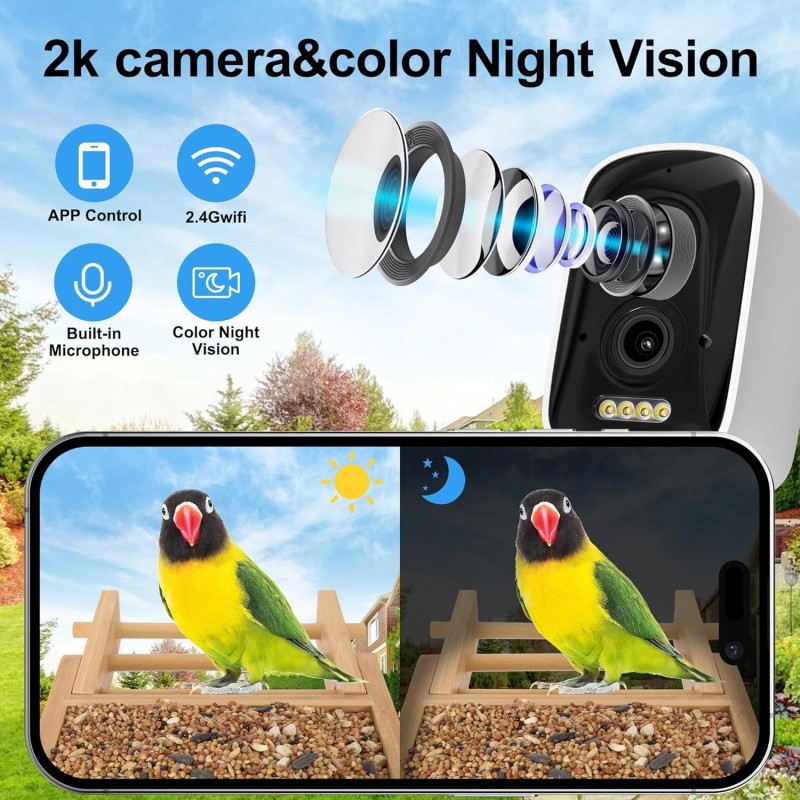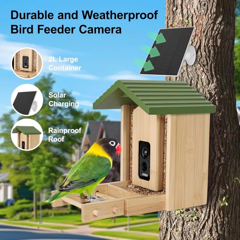 - 【Weatherproof and Bird-Friendly Design】Our birdfeeder camera is professionally designed, IP65 weatherproof that protect the camera and seed keep dry. 2L large capacity container can store enough food for birds so you don't need to add bird food frequently.