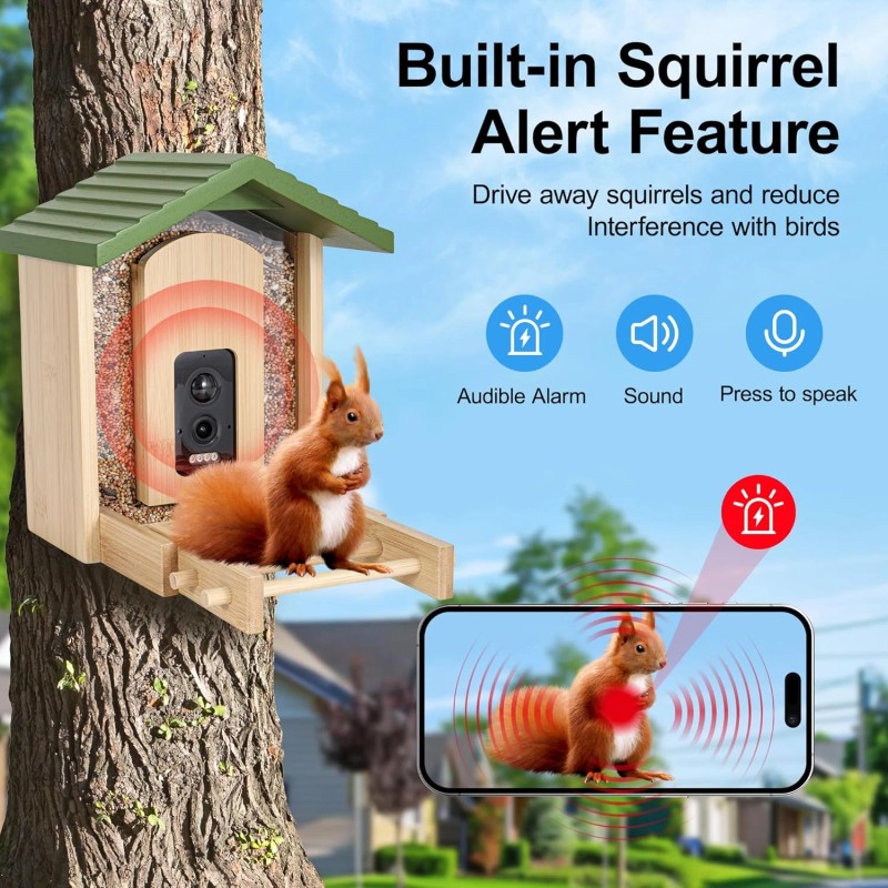 - 【Keep Squirrels Away】The bird camera can auto-capture coming birds,record videos of birds entering the detection area,and your phone can receive instant notifications with high-resolution snapshots.Meanwhile,it can accurately identify squirrels,you can drive away squirrels or unexpected visitors by siren.