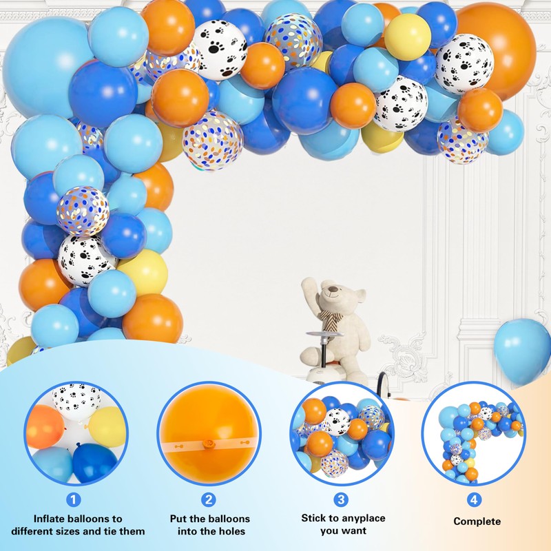 - COMPLETE SET: Includes balloon arch garland kit with blue, orange, yellow, and paw print pattern balloons, plus a festive birthday backdrop banner