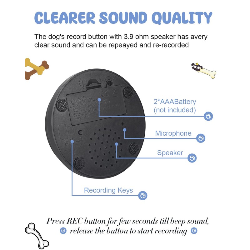 • 【Recordable Buttons for Dogs】Acools dog button has a built-in metal 3.9 ohm speaker for louder and clearer playback volume. Simply press and hold the (REC) button to use, start recording when you hear a "beep", release the REC button when recording is complete and you can hear a "beep" sound, click the button and hear your recorded voice. The recording time is over 30 seconds long and the dog talk button is powered by 2 AAA batteries (Not Included).