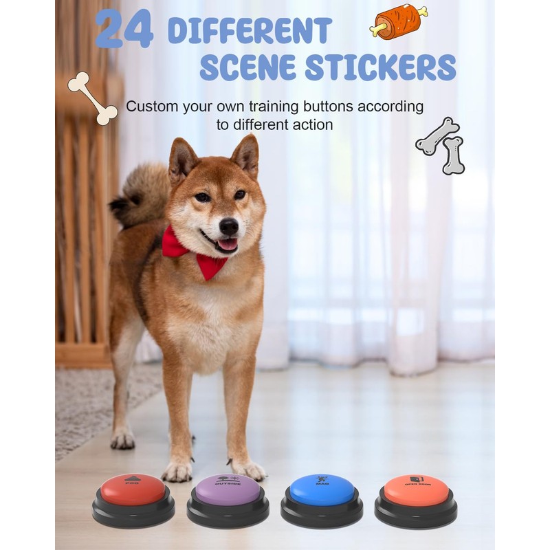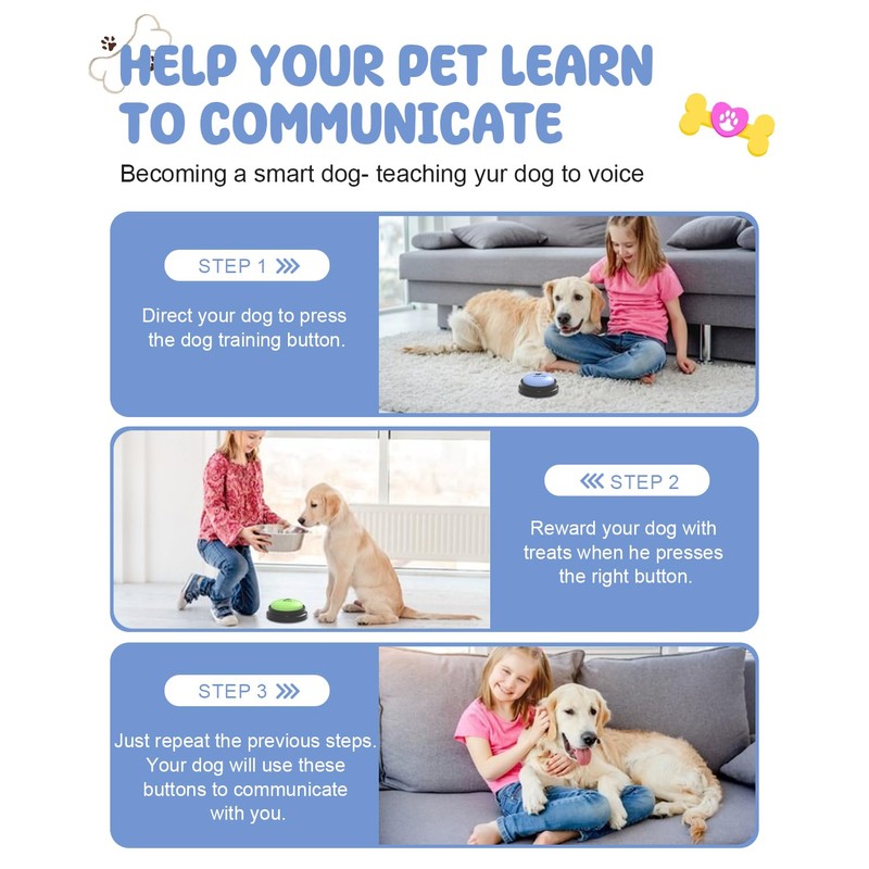 • 【High Quality, Multi-Functional】Dog speech training buttons are made of high quality ABS plastic with a reinforced finish that helps withstand pets tapping and stomping during use. Set of 8 recordable buttons for dogs and cats comes with gift wrap and instructions to teach your dog or cat to press the correct buttons. Communication buttons are not only suitable for pet training, but also can be applied to entertainment interaction, pranks, desktop gadgets, messages, etc.