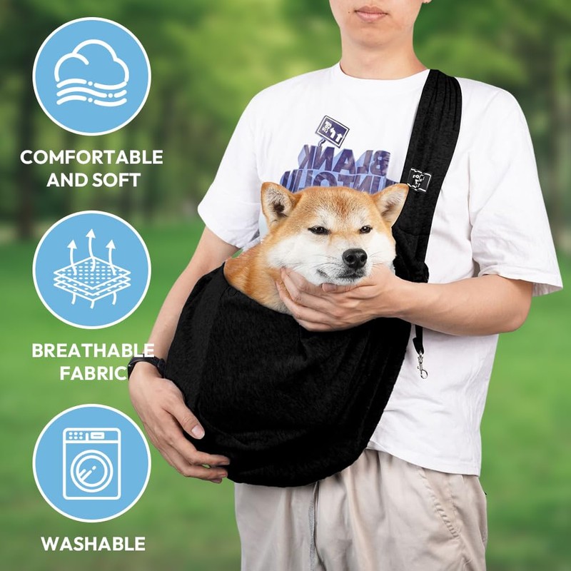 - ZIPPER POCKET Dog bag for small dogs gives a front pocket for your stuff, such as treats, poop bags, purse, cell phone or keys. Depending on the comfort, you can choose any side shoulder to carry the bag. Dog sling is durable, reversible and machine washable, you can easily clean it every time it gets dirty, or simply turn it to the other side.