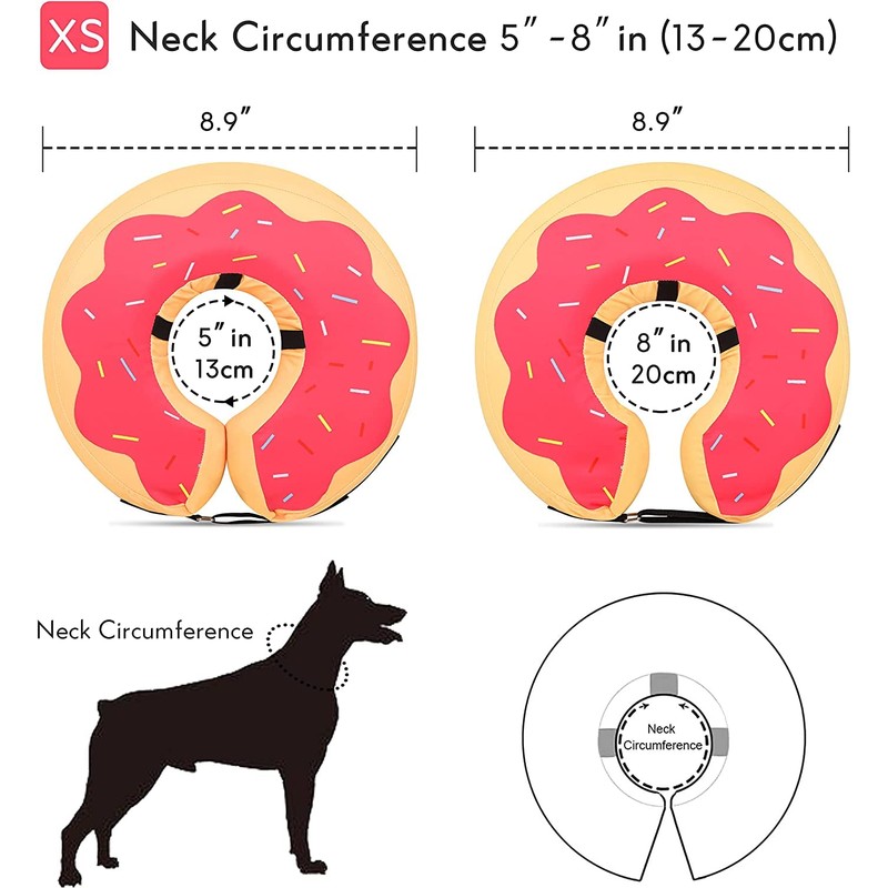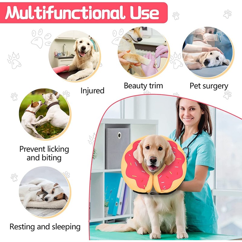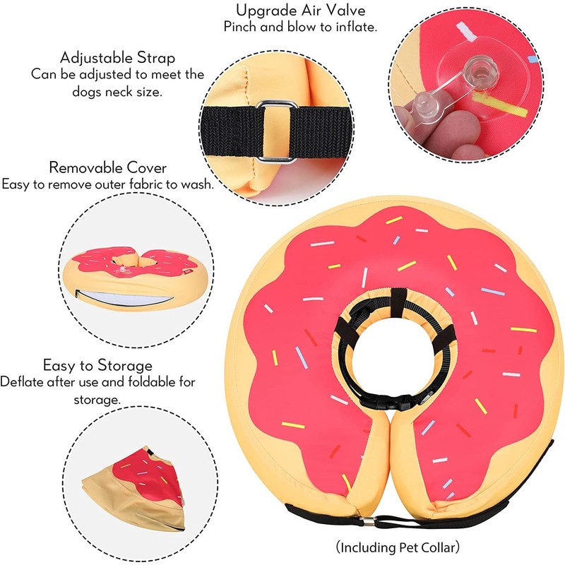 - 生Effective Inflatable Dog Cone Collar - This inflatable dog donut collar is a perfect dog neck cone alternative after surgery. The cone for dogs after surgery can prevent pets from licking wounds, sutures, especially rashes or after surgery, and allow your pet to eat, drink, and sleep normally, which is good for recovery.With this E-Collar on, the unique and cute donut shape makes it like a pet ornament instead of a dog surgery collar, your pet must be a million times happier with this.
