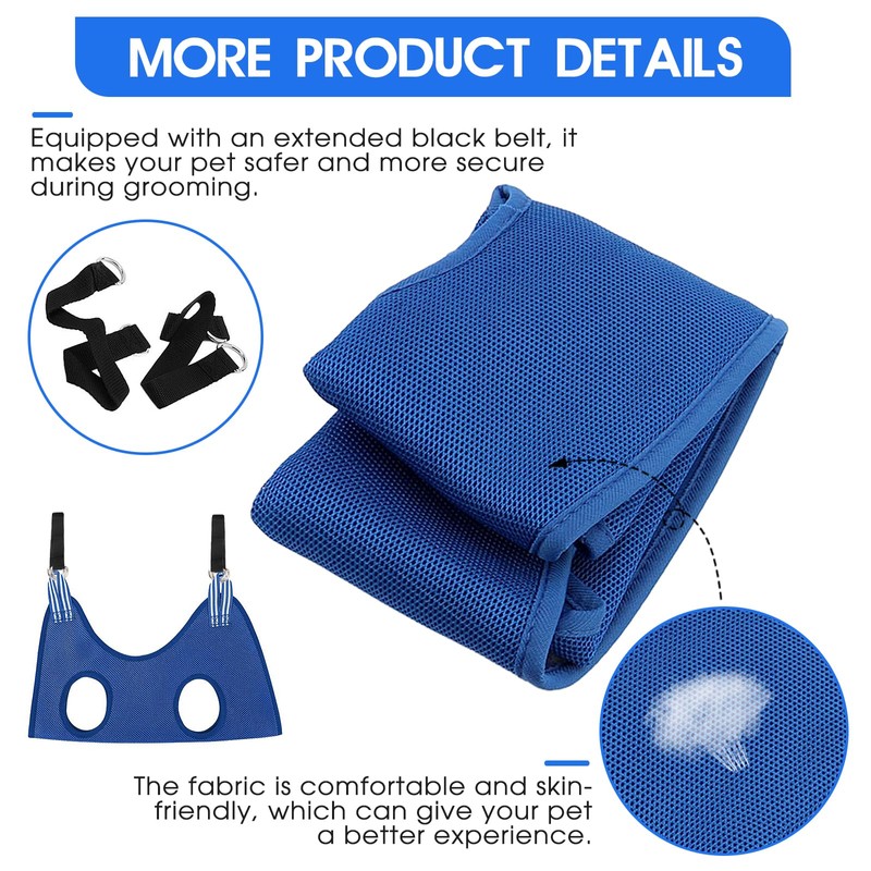 - Secure & Safe: With a D-ring clip and extended black belt, this dog grooming hammock offers a secure and stable setup. It provides peace of mind during grooming, keeping your pet safely in place throughout the session.