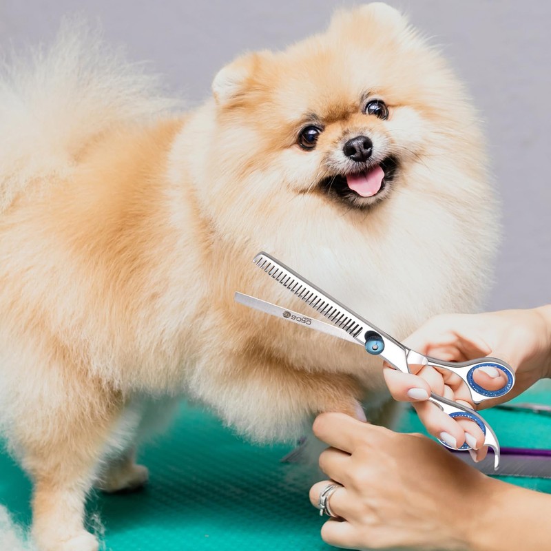 - Dog Grooming Scissors Set with Safety Round Tip, Curved Pet Cat Hair Cutting Trimming Grooming Shears, Also Include Thinning Scissors & PU Leather Pouch (Stainless Steel)(6 Inches)(Chrome) (2 Pieces)