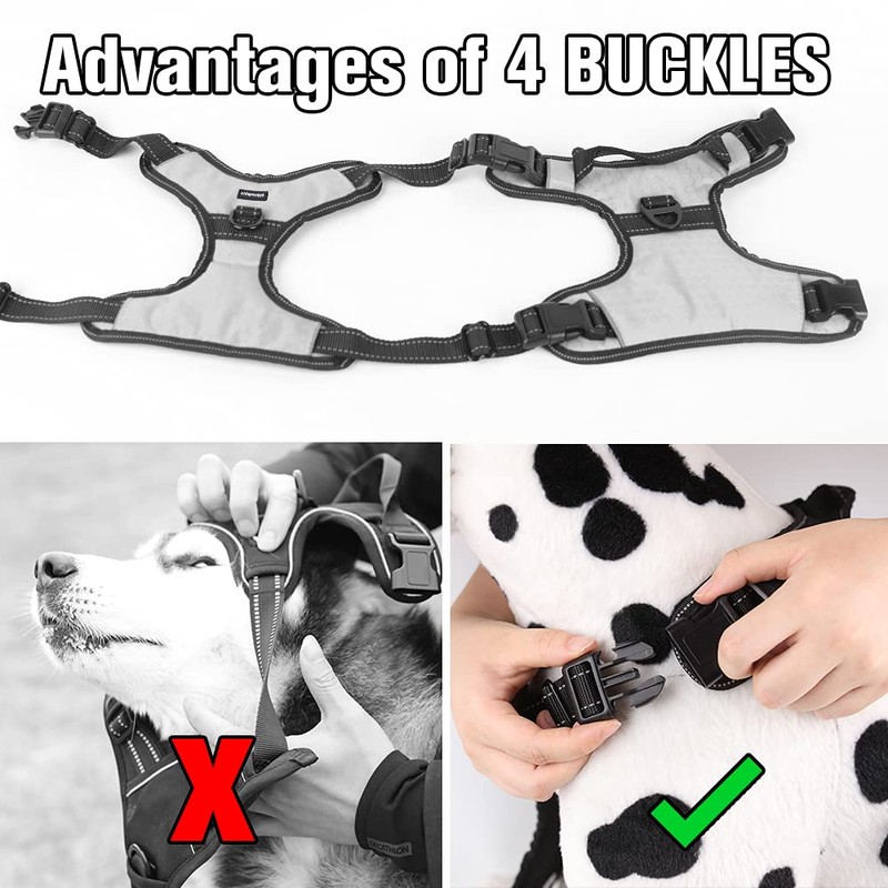 - NEW VERSION, SUPER EASY TO USE: This no pull dog harness has 4 easy buckles for easy on and off, no need to slip over dog’s head and adjust the straps every time.