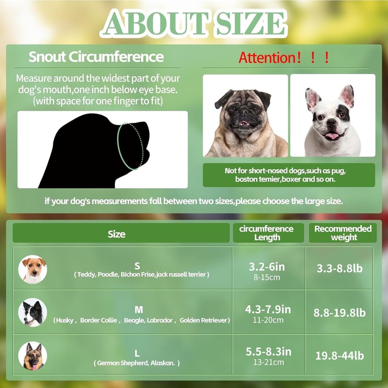 • Size and dimensions of the dog mask: please measure the circumference and length of your dog's nose before purchasing. The size we provide is suitable for a nose circumference of 8-21 cm. This mask is suitable for small dogs weighing 1.5 to 20 kg. If you have any questions about the size, please send us an email and we will reply you within 24 hours.
