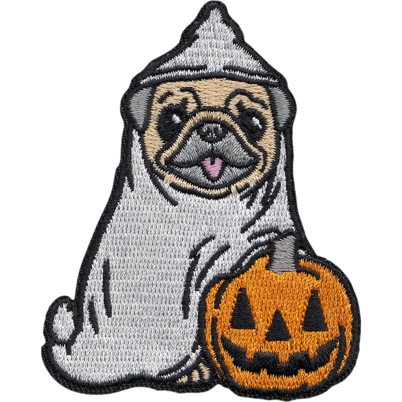 Dog - Pug Ghost with Pumpkin - Embroidered Iron on Patch