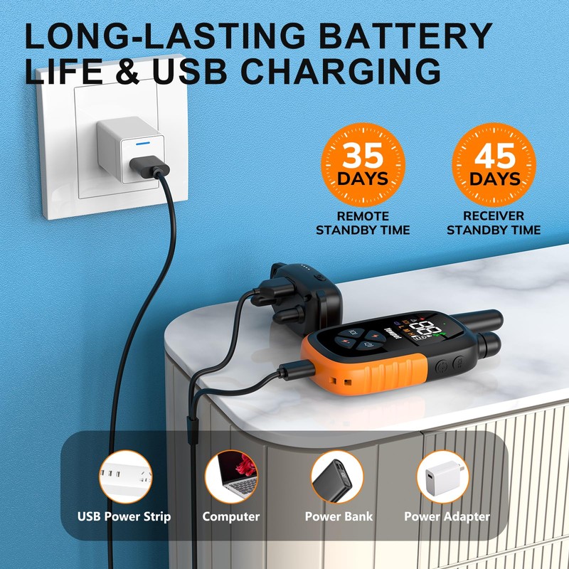- Fasting-Charging & Long Battery Life :The battery of this rechargeable dog e-collar lasts for a long time, it takes only 2-3 hours to be fully charged. The dog training collar can last up to 35 days of standby time and the remote 45 days