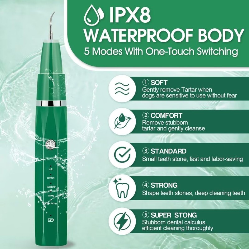 - FULL BODY WASHING + FIVE MODES: IPX8 waterproof for easy rinsing. The dog teeth cleaner features five modes—Soft, Comfort, Standard, Power, and Ultra—with one-touch switching. Use Soft mode initially for best results