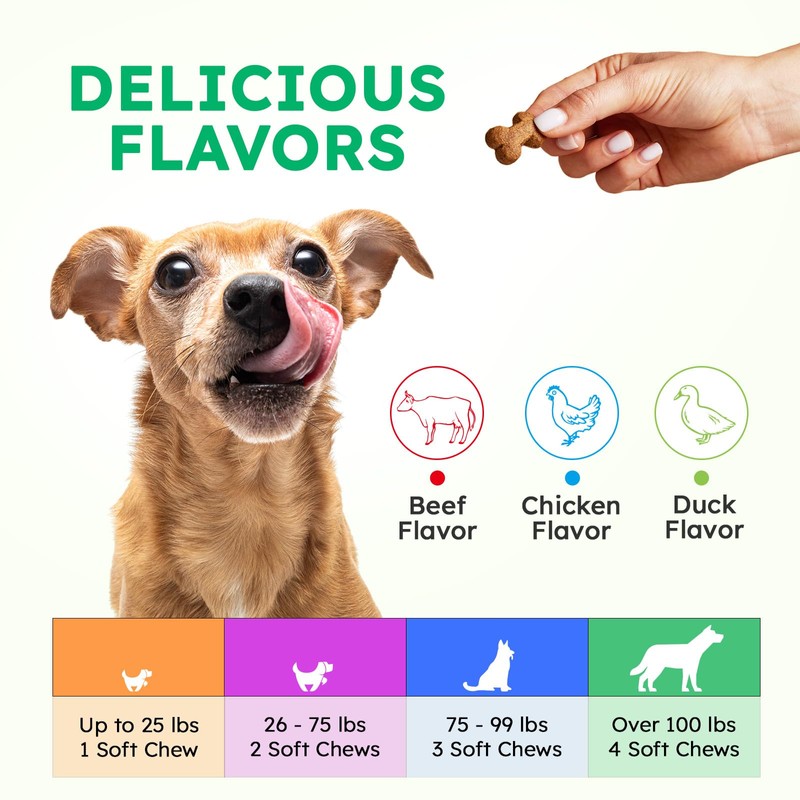 - 🦴DELICIOUS FLAVOR DOGS LOVE: Available in chicken, duck and beef flavor, these dog vitamins chews are not just effective but tasty too. No more wrestling with your doggy to take their vitamins; they'll be begging for more of these delicious and healthy dog treats!