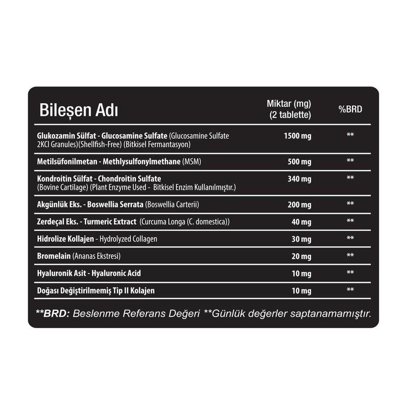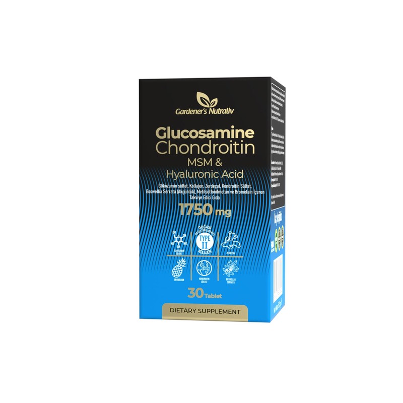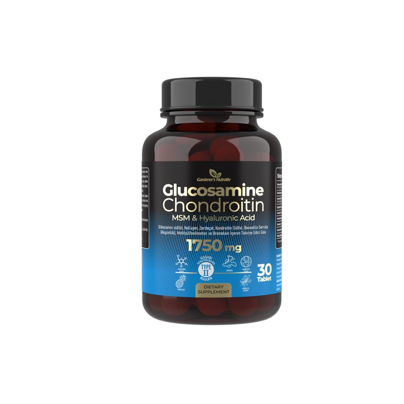 - Gardener’s Nutralive Glucosamine 1750 mg ürünü 30 Tablet olup Glukozamin Sülfat, Kollajen, Zerdeçal, Kondroitin Sülfat, Boswellia Serrata (Akgünlük), Metilsülfonilmetan ve Bromelain İçeren Takviye Edici Gıdadır.