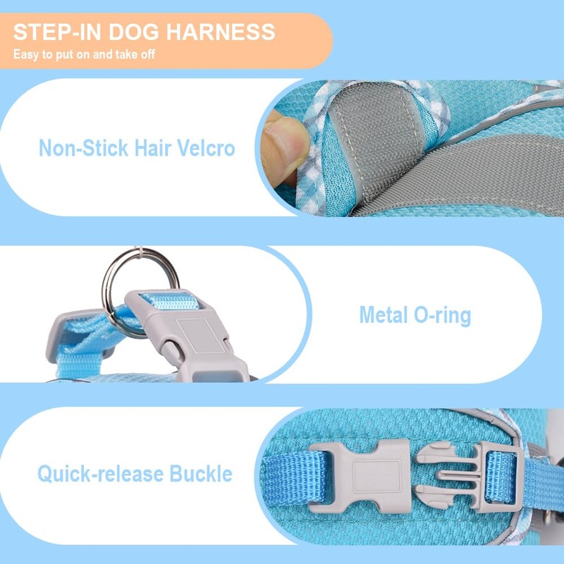 - 【Soft Breathable Mesh】Step-in dog harness is made of premium knitted mesh fabric,which is lightweight,high-density,flexible,and super comfortable,suitable for all seasons,keep your pet cool even in the hot weather,and the sturdy webbing can prevent chewing or tearing. Your dog will enjoy the daily walking in this comfort no pull dog harness!