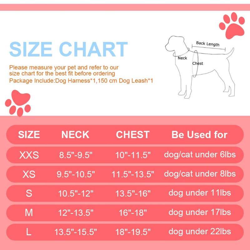 - 【Measure Before Ordering】To better fit your dog Please measure your dog's size and compare with our size chart before placing an order,if in between sizes, please order one size up.This easy walk dog harness is suitable for extra small to medium sized dogs,puppies and cats,such as Boston Terrier,Maltese,Pekingese,Chihuahua,Poodle,Teddy,Schnauzer and so on.
