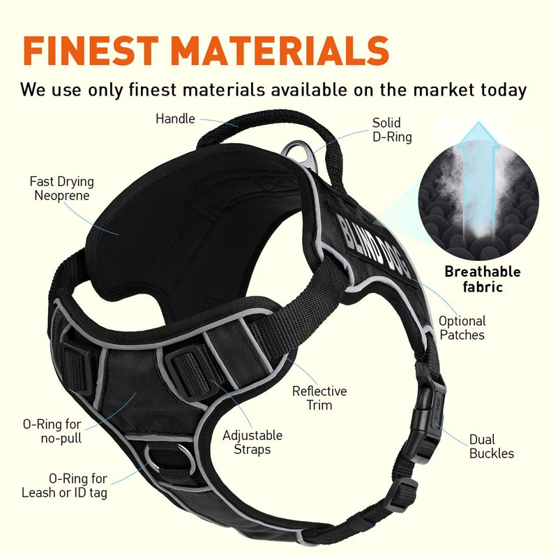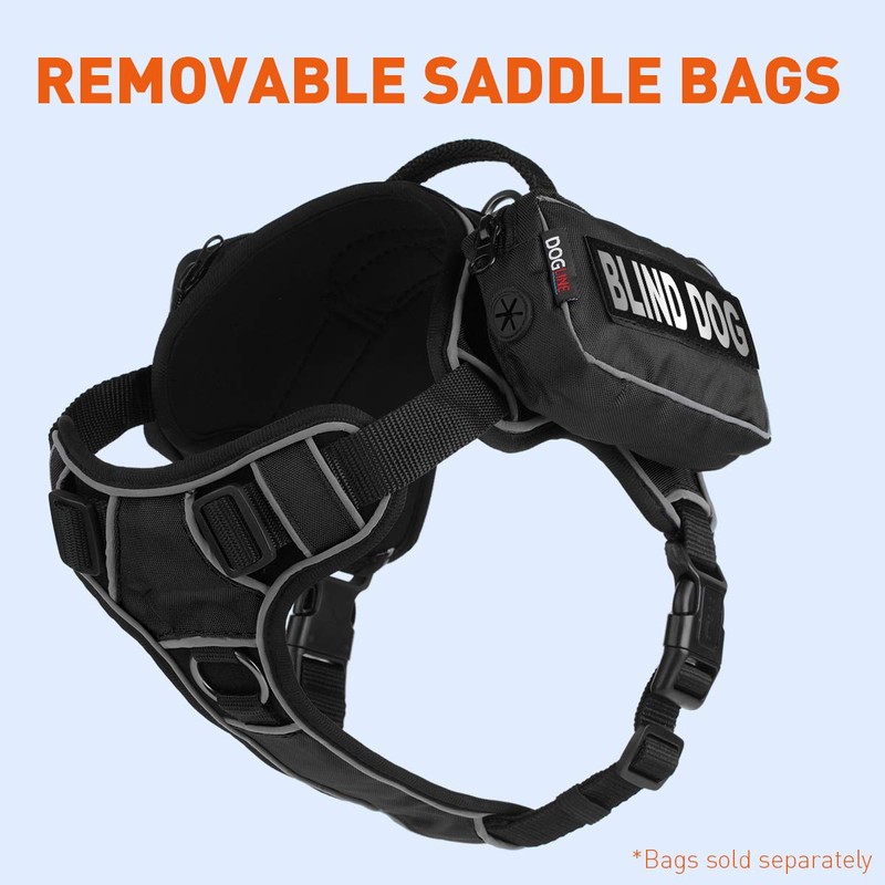 Dogline Quest No-Pull Dog Harness with Blind Dog Reflective Removable Patches Reflective Soft Comfortable Dog Vest with Quick Release Dual Buckles Black Hardware and Handle 25 to 31 inches Black