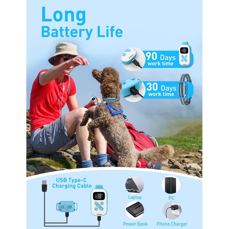 - Long Battery Life and 2800Ft Remote Range : Fully charged, our smart anti barking collar lasts up to 30 days with the remote and 90 days with just the receiver. With a range of up to 2800Ft, your dog can roam freely while you maintain control, perfect for indoor or outdoor training