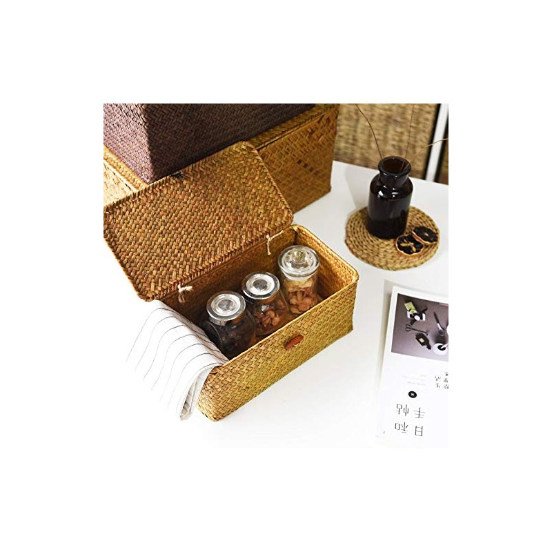 DOKOT Seagrass Storage Baskets with Lid Natural Rattan Woven Rectangular Organizer Box (Small 26cmx14cmx11cm H)