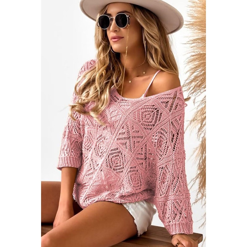 Dokotoo Women's Spring Crochet Hollow Out 3/4 Sleeve Pullover Sweater Resort Wear for Women 2025 Off Shoulder T-Shirts Country Concert 0utfits for Women Pink Small