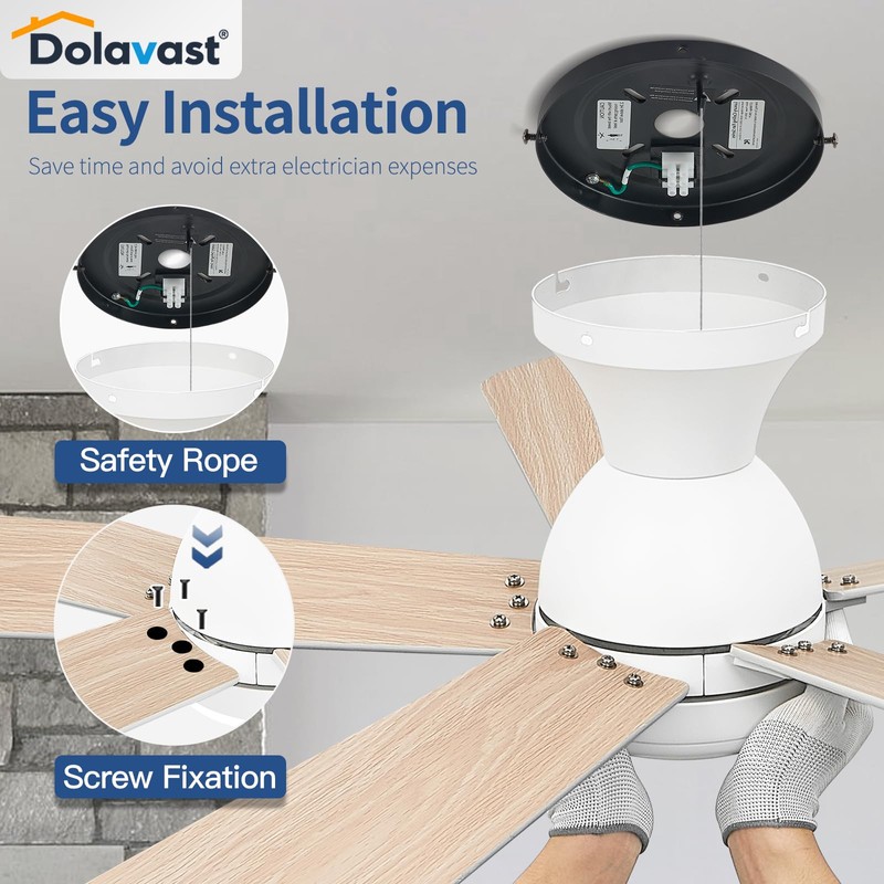 Dolavast Ceiling Fans with Lights and Remote, 48 Inch Ceiling Fan with Light, Low Profile, Reversible, Dimmable LED, Flush Mount, Quiet, DC Motor, White Ceiling Fan for Bedroom, Kitchen, Dining Room