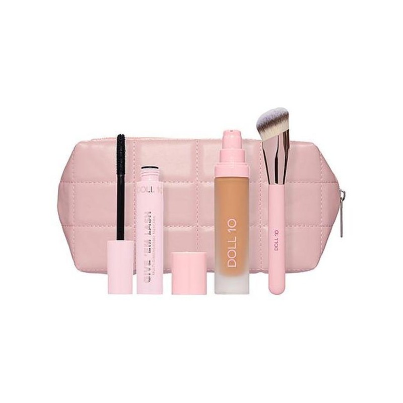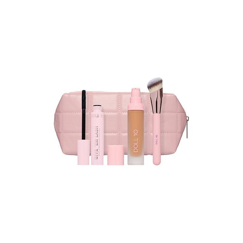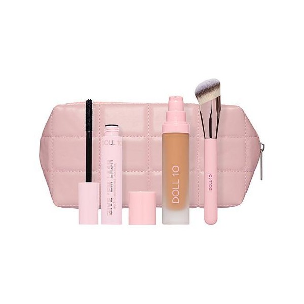 Doll 10 Icons 4-piece Collection What It Is Get ready to experience the best of Doll 10 Beauty. This collection includes This Covers Everything Super Coverage Serum Makeup, Give 'Em Lash Multi-Dimensional Mascara and a foundation brush packed in a quilted makeup bag. Apply the full-coverage foundation effortlessly with the special edition foundation brush and then pump up the dimension and volume with Doll 10's rich black mascara. Packaged together with a cute quilted makeup bag, this set is perfect for the makeup lover in your life... whether that's you or a member of the family! What You Get 1.1 fl. oz. T.C.E. Super Coverage Serum Makeup with Peptides Special Edition Airbrush Foundation Brush .4 fl. oz. Give 'Em Lash Multi-Dimensional Mascara Quilted Pink Cosmetic Bag What It Does T.C.E. Super Coverage Serum Makeup with Peptides One drop provides concentrated, clean coverage with a real-skin like finish while wrapping your skin in a cocoon of hydrating ingredients including peptides, Vitamin C, magnesium, green tea extract and aloe vera extract The special blend of silk pigments is weightless on the skin and will never crack, crease or settle into texture Intentionally clean and cruelty-free Formulated with chamomile, cucumber, licorice, algae, magnesium, Vitamin C, aloe extract, Vitamin E, lavender extract, green tea and peptides Non-irritating Special Edition Airbrush Foundation Brush Custom brush to achieve a flawless finish The ultra-soft, synthetic bristles can be used with liquids, creams and powders to achieve perfect placement, easy blending and application every time Blends expertly for foolproof looks with every application Made with synthetic hair and wooden handles Give 'Em Lash Multi-Dimensional Mascara Gives you the faux-lash look with your own natural lashes Exclusive, rich-black mascara provides extreme length and look of volume Contains waxes to condition lashes Promotes healthier looking and temporarily longer lashes Resists clumps and lumps Quilted Pink Cosmetic Bag The perfect accessory for all of your must-have Doll 10 products This extremely convenient and beautiful bag is great for storing your favorite collection