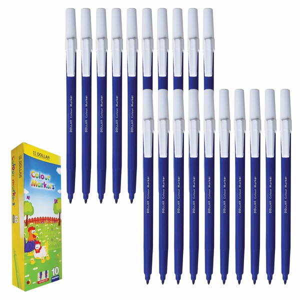 DOLLAR ColourMarkers Felt Tip Colouring Pens, BLUE, Fine Point, Pack of 20, Draw Colour Mark Sketch Write Shade Underline, School Office Home Everyday Use
