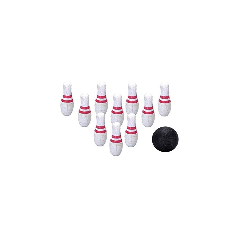 - The ten pins are painted white with two red stripes and the ball is painted black.