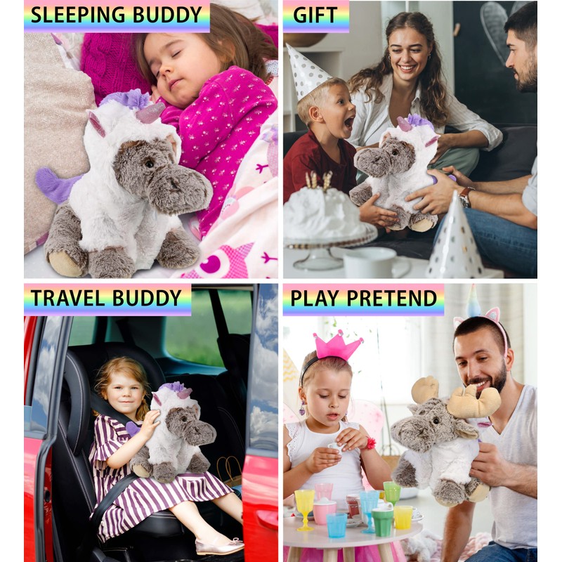 - IDEAL USE FOR THE MOOSE UNICORN STUFFED TOY PLUSH – Make your kid's day by surprising him or her with a Moose Unicorn Small Stuffed Animal! The Moosecorn puts a twist to your usual unicorn plushes and makes an amazing addition to your kids collection of unicorn stuffed toys. Kids will love dressing up Moosecorn and play pretend; it makes a great sleeping buddy and travel buddy.