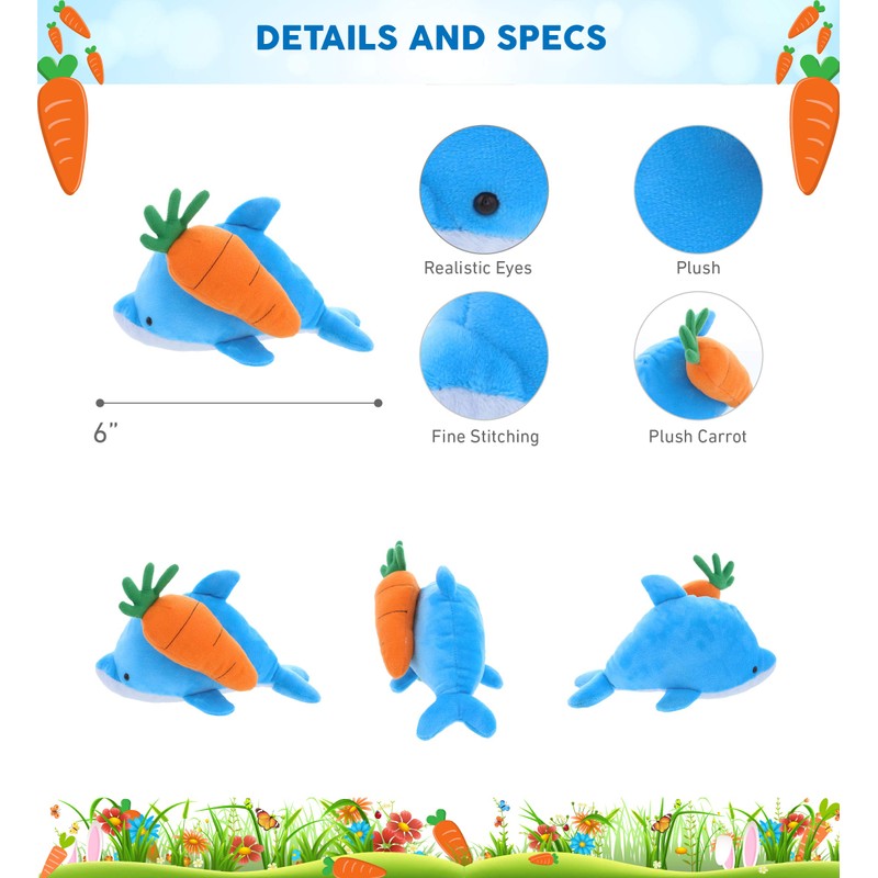- INCLUDED WITH THE PURCHASE - Includes 1 DolliBu Super Soft Plush Dolphin stuffed toy perfect to celebrate the beginning of a new season. The dolphin sea life plush comes with an orange carrot stuffed toy attached to the side of the stuffed animal. Decorated with a unique blue fur, realistic flippers design, and super soft fabric that makes it perfect for cuddles and snuggles. This cute dolphin plush toy measures 6" inches.