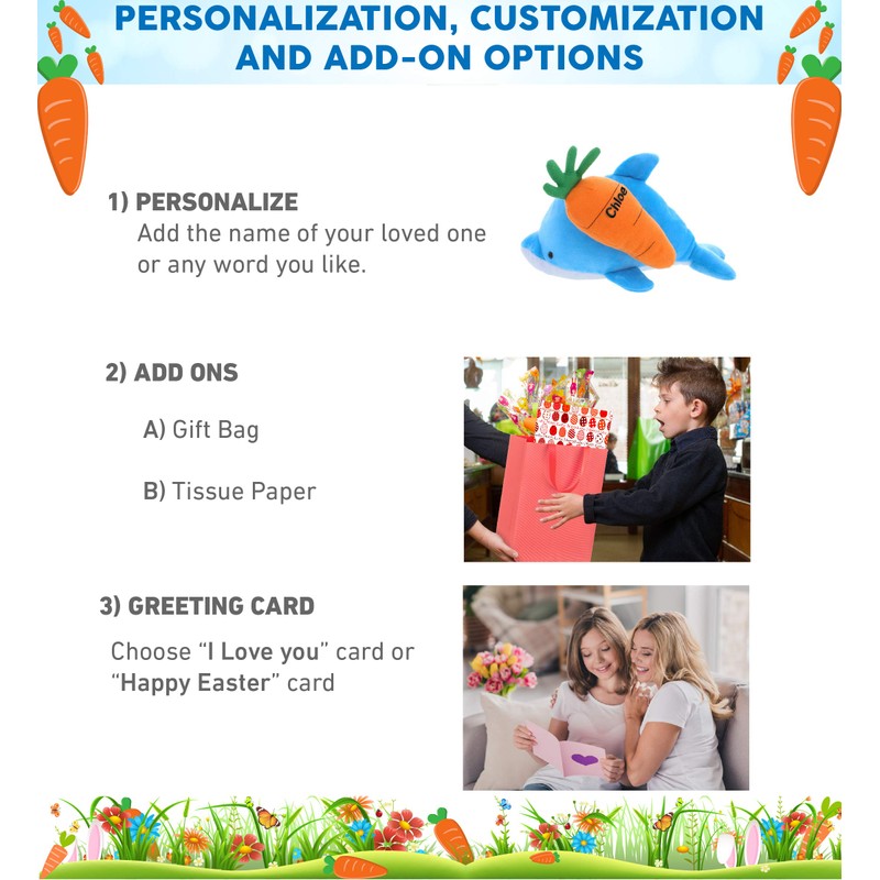 - PERSONALIZATION, CUSTOMIZATION, AND ADD-ON OPTIONS - Super Soft Plush Dolphin comes customized with a stuffed carrot toy. You can turn it into a personalized stuffed animal with the name of a loved one, or add any word which we will imprint on the item. And last, you have the option to add some or all of the cool add-ons to make your gift extra special: 1) Gift Bag 2) Tissue Paper 3) Greeting Card.
