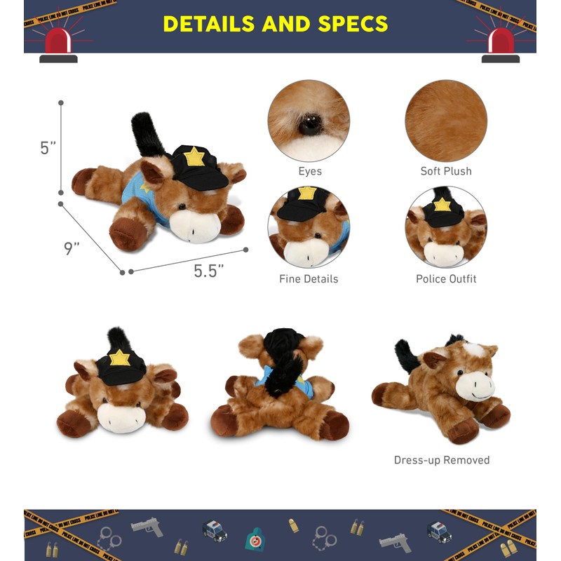 - INCLUDED WITH THE PURCHASE - Includes 1 Soft Lying Brown Donkey Plush Toy in a police officer uniform. The donkey plush animal wears a blue police uniform shirt with a black tie and yellow star black cap. The black cap complements the stuffed toy's cute uniform. Decorated with a body made of soft fabric and fluffy plush that makes the cop bear perfect for cuddles and snuggles. This cute donkey police stuffed toy measures 9Lx5.5Wx5H inches.