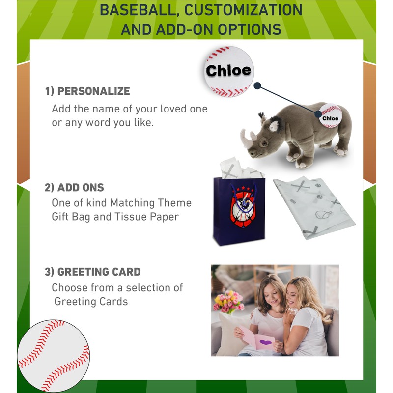 - PERSONALIZATION, CUSTOMIZATION, AND ADD-ON OPTIONS - Super Soft Sports Stuffed Animal Rhino comes customized with a Baseball Plush. You can personalize it with the name of your loved one imprinted on the item. You also have the option to add some or all of the cool add-ons to make your gift extra special: 1) Gift Bag; 2) Tissue Paper; 3) Greeting Card.