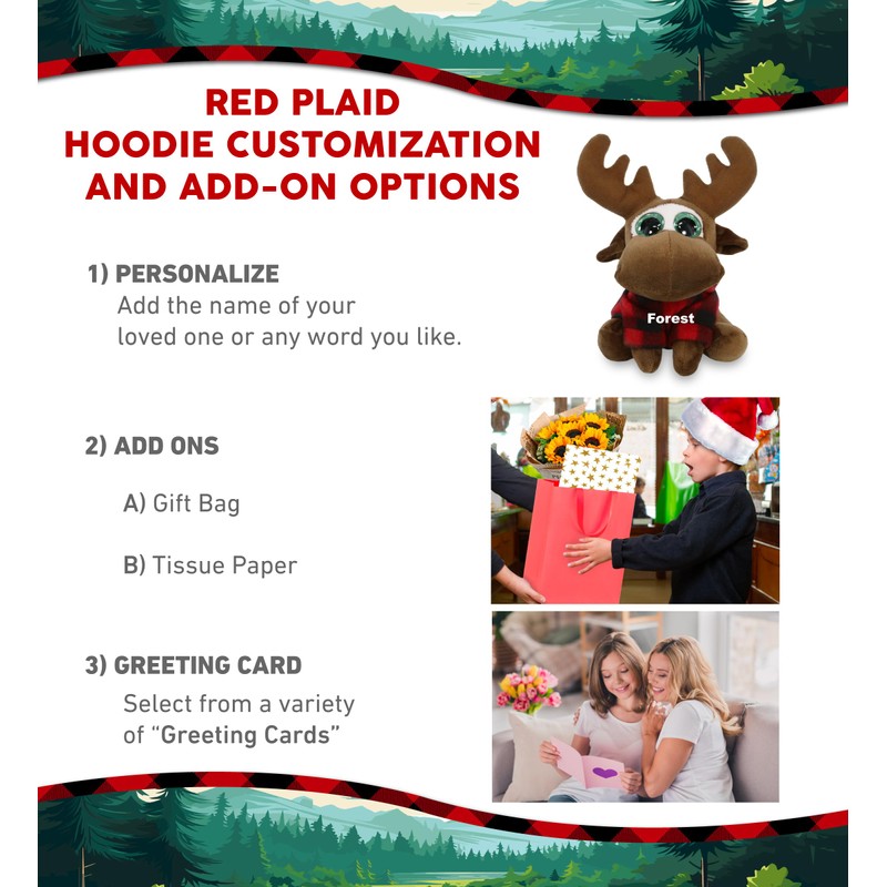 - PERSONALIZATION, CUSTOMIZATION, AND ADD-ON OPTIONS - The Super Soft Sparkle Eyes Moose Stuffed Animal comes dressed in a cozy teddy bear costume, a red plaid hoodie. Make your moose plush more special by personalizing it with the name of your loved one, which we will print directly onto the plush. You can also customize your plush moose by adding any of our unique add-ons to create the perfect gift: 1) Gift Bag 2) Tissue Paper 3) Greeting Card.