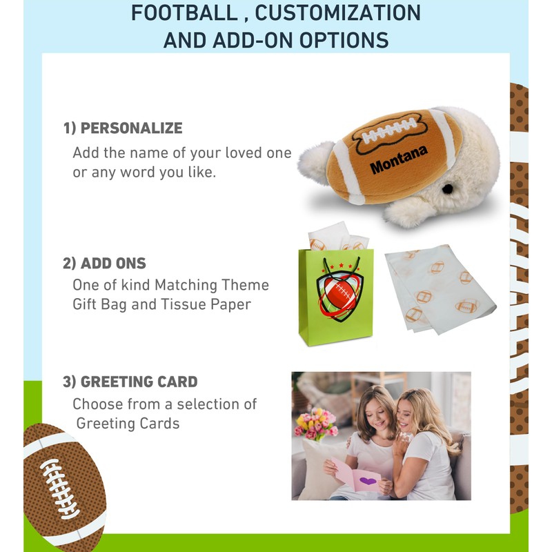- PERSONALIZATION, CUSTOMIZATION, AND ADD-ON OPTIONS - Super Soft Sports Stuffed Animal Small White Whale comes customized with a Football Plush. You can personalize it with the name of your loved one imprinted on the item. You also have the option to add some or all of the cool add-ons to make your gift extra special: 1) Gift Bag; 2) Tissue Paper; 3) Greeting Card.