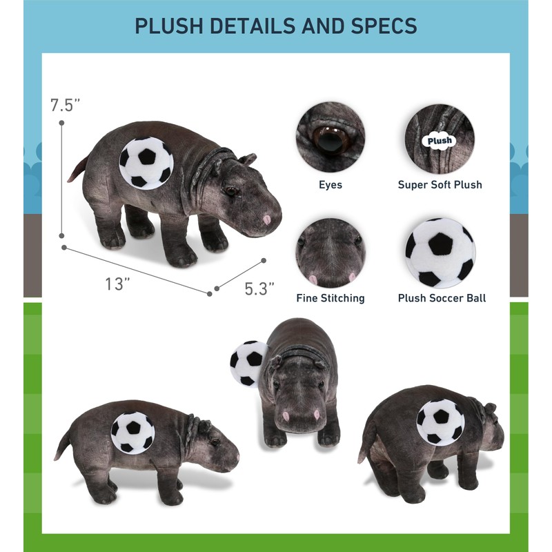 - Included with the Purchase of the Cute Super Soft Hippo Plush - Includes 1 DolliBu Wild Collection Hippo Super Soft Plush with a soccer ball plush, decorated with realistic features. The hippo's body with a sports gift ball plush makes the plush perfect for cuddles. The hippo plush toy features details like its characteristic ears. The hippo's eyes make the critter so charming. The cute hippopotamus plush toy buddy measures 13Lx5.3Wx7.25H inches.