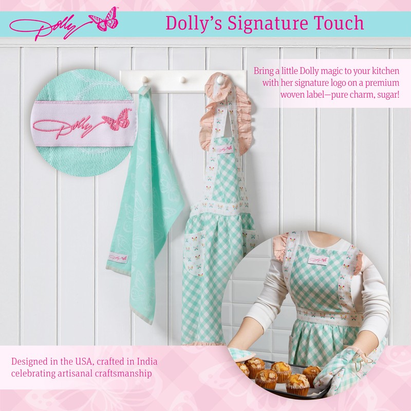- DOLLY CHARM APRON SET: This beautiful set coming from Dolly herself includes a super cute patterned apron with 2 pockets and a chef quality jacquard-woven kitchen towel with beautiful patterns to add some Dolly country love to your kitchen.