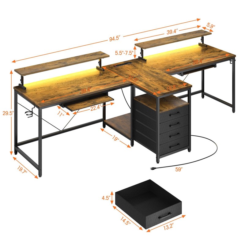 DOMICON 94.5'' Extra Long Computer Desk with Power Outlet & LED Lights, 2 Person Desk with Storage Shelves and Monitor Stand for Home Office, Double Gaming Desk, Brown