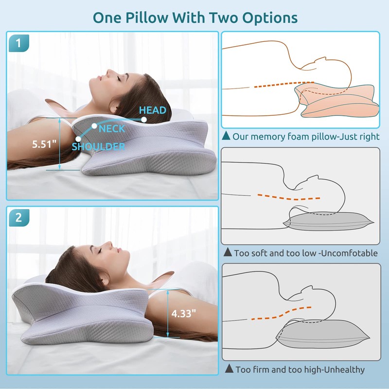 - 【QUALITY SLEEP STARTS WITH A GOOD PILLOW】Are you always waking up with neck cramps or back pain? Our proven ergonomically designed, contoured memory foam pillow supports your head, neck, shoulders and back perfectly. The innovative design allows our pillows to naturally fit your curved spine perfectly, providing proper support for spinal alignment,makes you to shift between positions comfortably.So you will wake up relaxed and start a more energetic day.