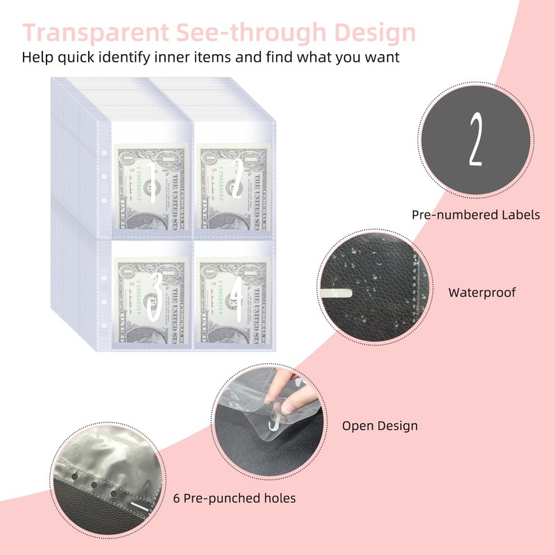 - Money Savings Binder Kit. You will get 1pcs A5 PU leather binder, 25pcs 6-hole cash envelopes pre-printed with 1 to 100, and 4pcs challenge tracking sheets for $500, $1000, $5050, and $10,000. Use this money saving binder to help you meet your budget goals.