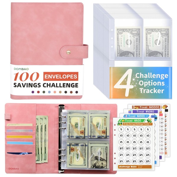 DONBAO 100 Envelopes Money Saving Challenge Binder, A5 Budget Binder with Envelopes and Challenge Tracker, 2024 New Savings Challenges Planner Book to Save $500, $1000, $5050, $10000 (Pink)