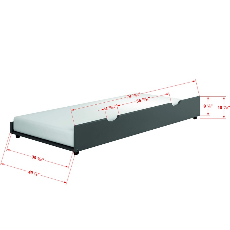This Donco Kids Twin Trundle Bed, Dark Grey measures 74" length x 41" width x 10" height.