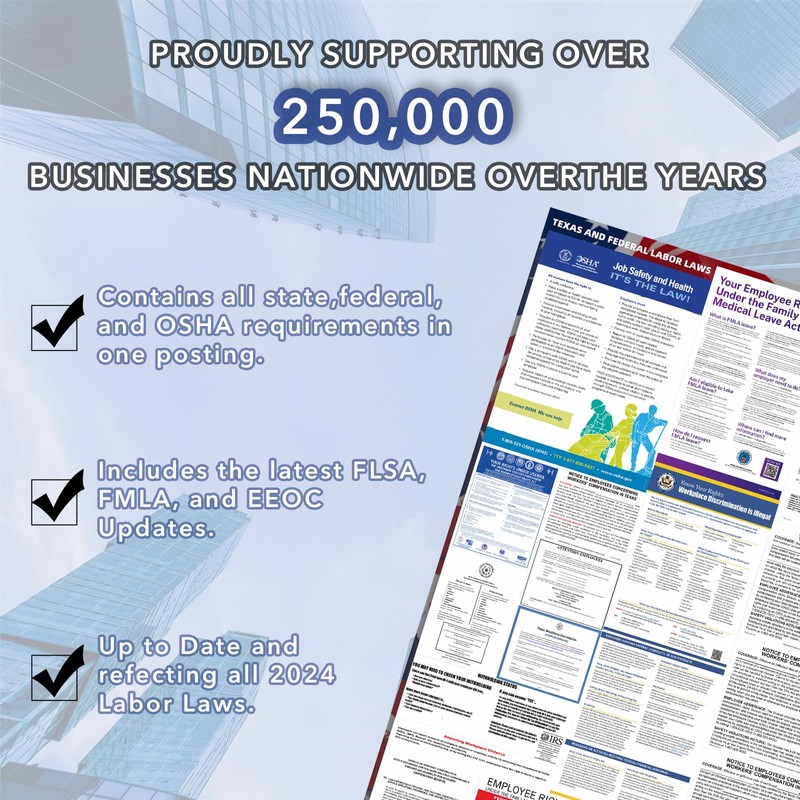 - ๐๐๐% ๐๐จ๐ฆ๐ฉ๐ฅ๐ข๐๐ง๐๐ ๐๐ฎ๐๐ซ๐๐ง๐ญ๐๐: Whether it's 2024 labor law poster texas or federal labor regulations poster, we ensure this poster aligns perfectly with the latest legal standards to safeguard employee rights. We guarantee that your workplace meets all legal requirements.