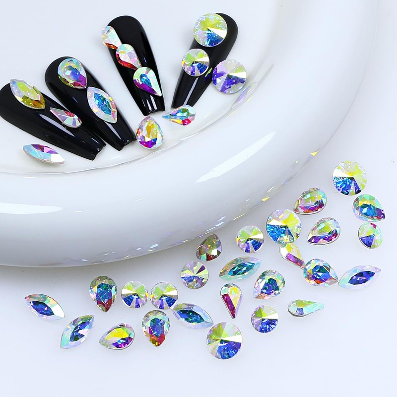 - What can you get? One colour: crystal AB. Rivoli shape 6 mm 30 pieces, 8 mm 15 pieces; teardrop shape 8 x 6 mm 15 pieces, 5 x 8 mm 30 pieces; navette shape 5 x 10 mm 15 pieces. Please note: these are pointed base nail rhinestones, and the size is large, please confirm before purchasing.